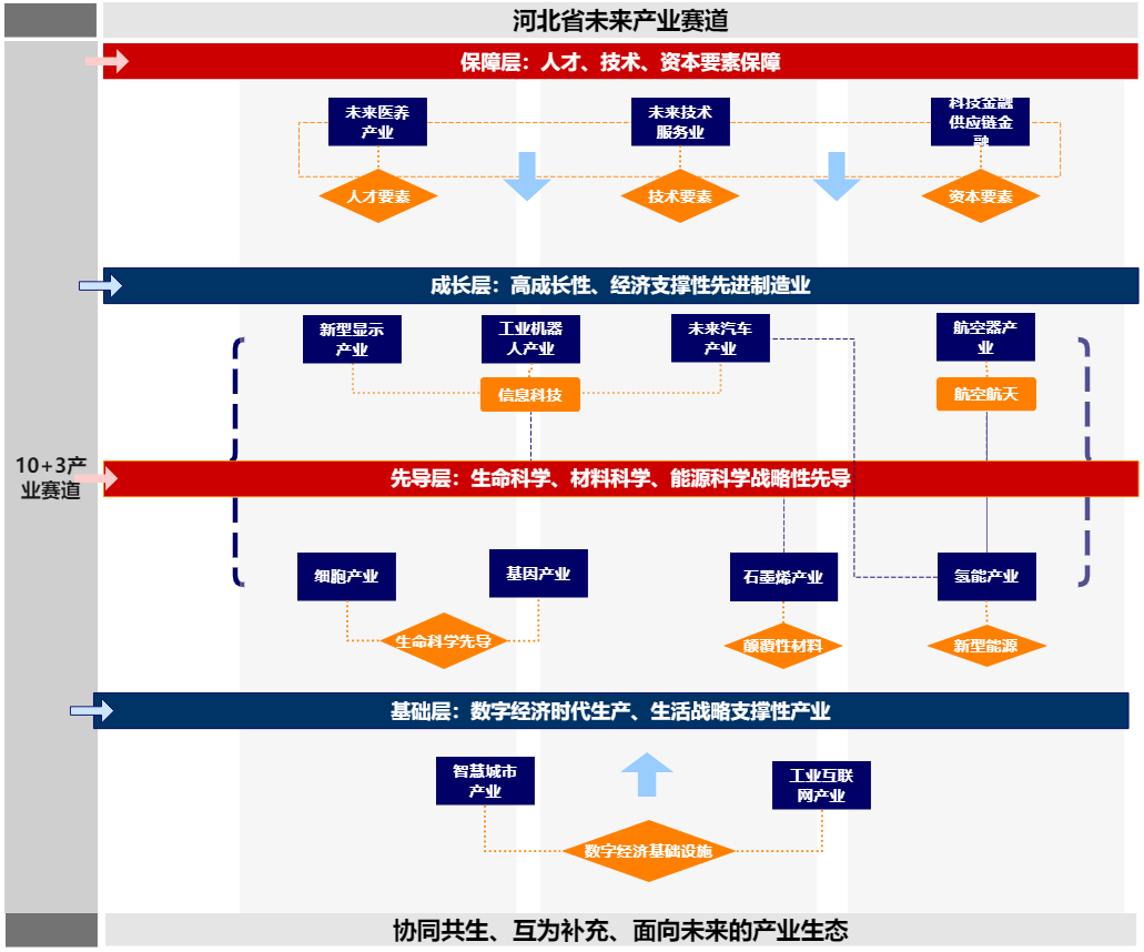 围绕面向经济主战场的基础技术和通用技术、河北省具有发展优势的非对称技术和“杀手锏”技术、未来具有高成长性的前沿技术和颠覆性技术,河北省可重点关注“10+3”未来产业体系,前瞻部署、抢抓机遇、集中攻关,打造协同共生、互为补充、面向未来的产业生态,寻求赛道突围。