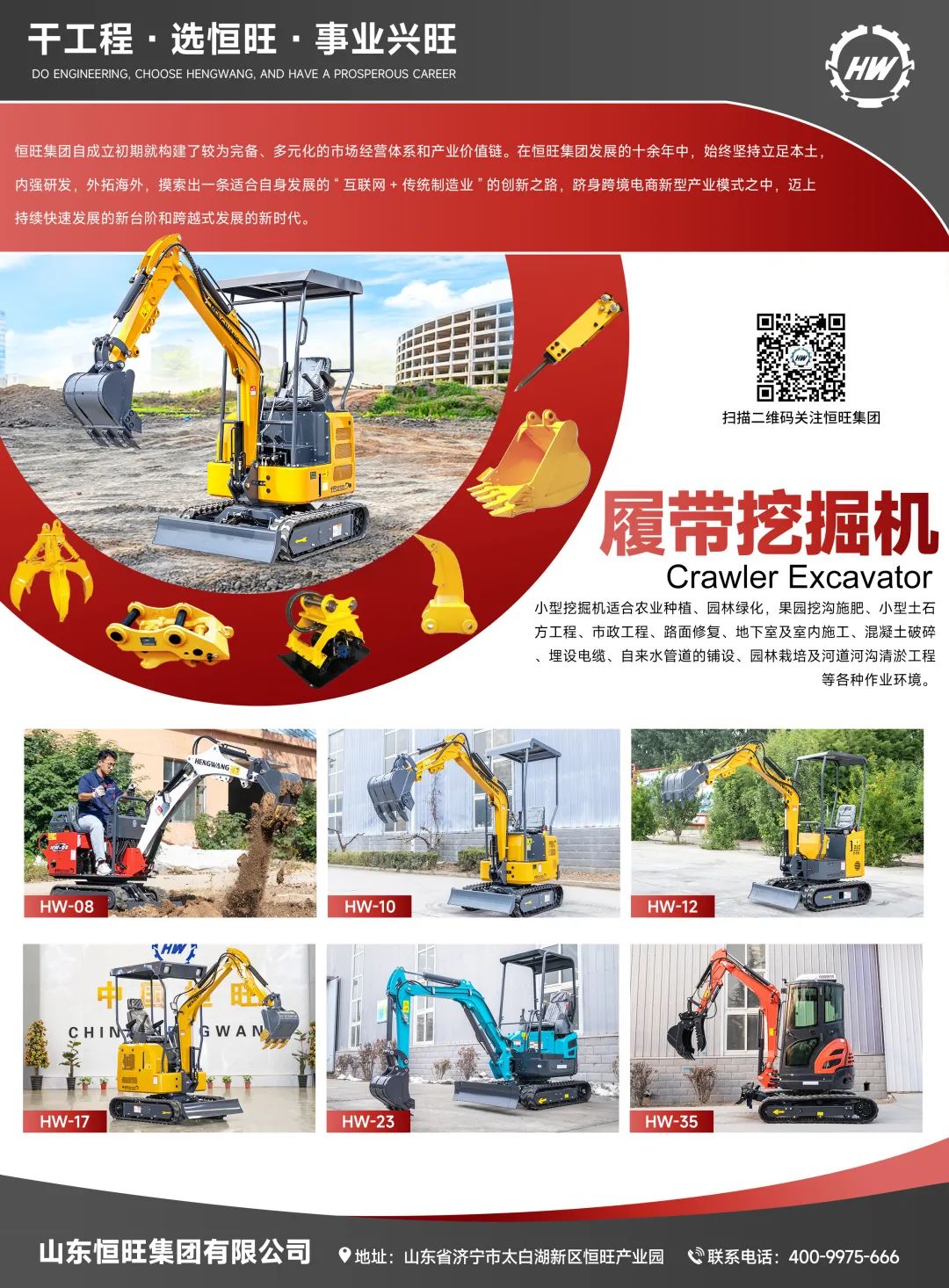 山东恒旺集团有限公司,创立于2011年,注册资金一亿元,坐落于运河之都、孔孟之乡的中国文化名城——山东济宁。经过十余年的发展,现已成为一家集研发设计、生产制造、国际贸易、电子商务、物流运输为一体的国家高新技术企业。以研发之长,领技术之先。恒旺依托科技创新,依据市场发展和客户需求,不断研发出各种新型实用机械设备。当前主营产品覆盖挖掘机、推土机、钻探机械、新能源光伏打桩机、压路机、履带运输车等40多个品类。厂区占地面积10余万平方米 ,现有员工1000余人。