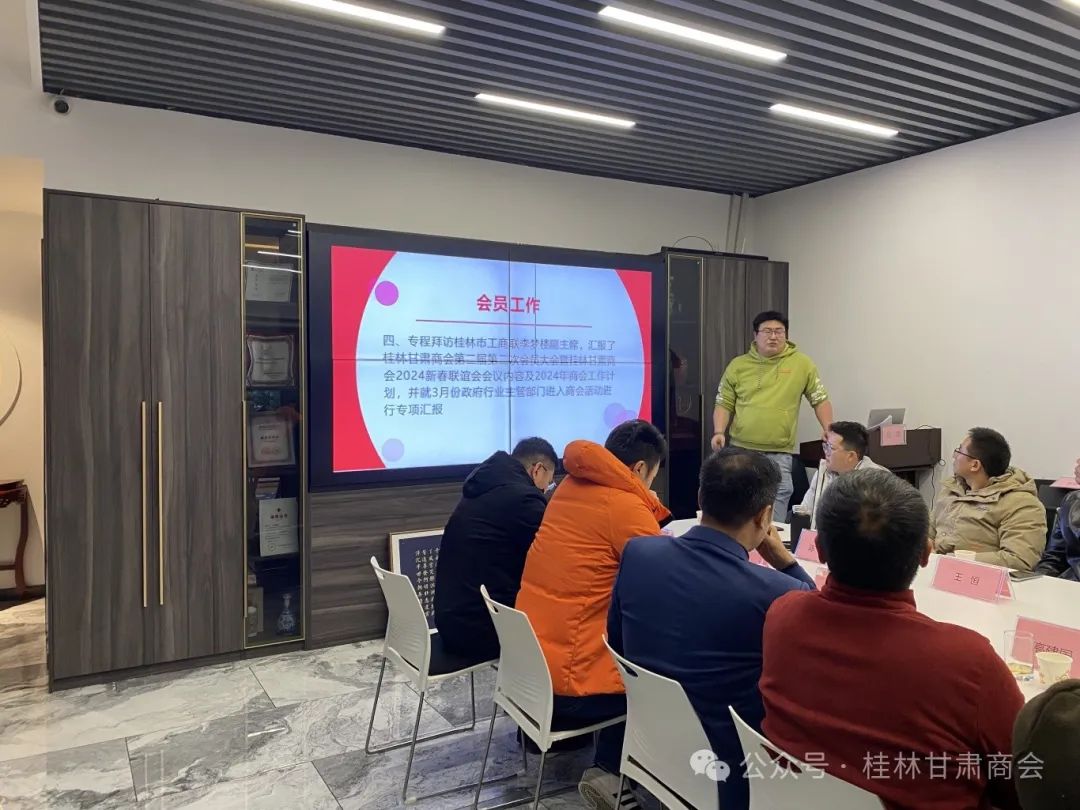 其次,执行秘书长刘军对秘书处二月工作总结及三、四月工作计划作了详细汇报,并进行了解析讨论。工作总结中,刘军回顾了二月份完成的各项活动,特别是对2月25日在桂林碧玉国际大酒店举行的《桂林甘肃商会第二届第二次会员大会暨2024新春联谊会》进行了详细汇报,大家一致认为该会议凝聚人心、提振士气,展示了商会的活力与成果。工作计划中,刘军重点介绍了将继续收集整理会员信息、制作会员信息电子手册、策划主题沙龙等工作,同时,讨论了关于筹备拟定于4月18日召开的《甘肃县域优势特色产业(桂林)推介会暨桂林甘肃商会五周年庆典》活动的各项事宜。与会人员表示全力支持,并且希望通过本次大会能更好促进陇桂两地沟通、助力家乡各市州县域经济的发展。另外,与会人员就如何提高秘书处的工作效率、加强部门间的沟通交流及新项目的奖励机制等方面进行了广泛讨论并达成了统一意见。