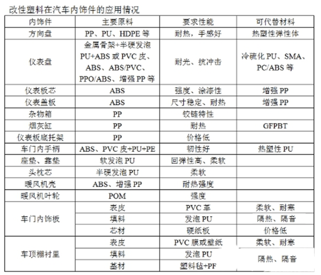 近年来改性塑料在汽车上的用量迅速上升。主要品种有PP、PS、ABS、PU、PVC、PE、SAN、SMA等。汽车改性塑料行业应用分析详情如下。