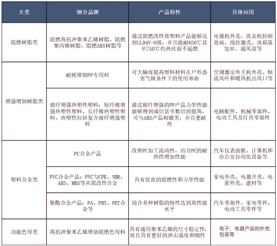 按照改性塑料的功能,一般可以分为阻燃树脂类、增强增韧树脂类、塑料合金类、功能色母类几大类。