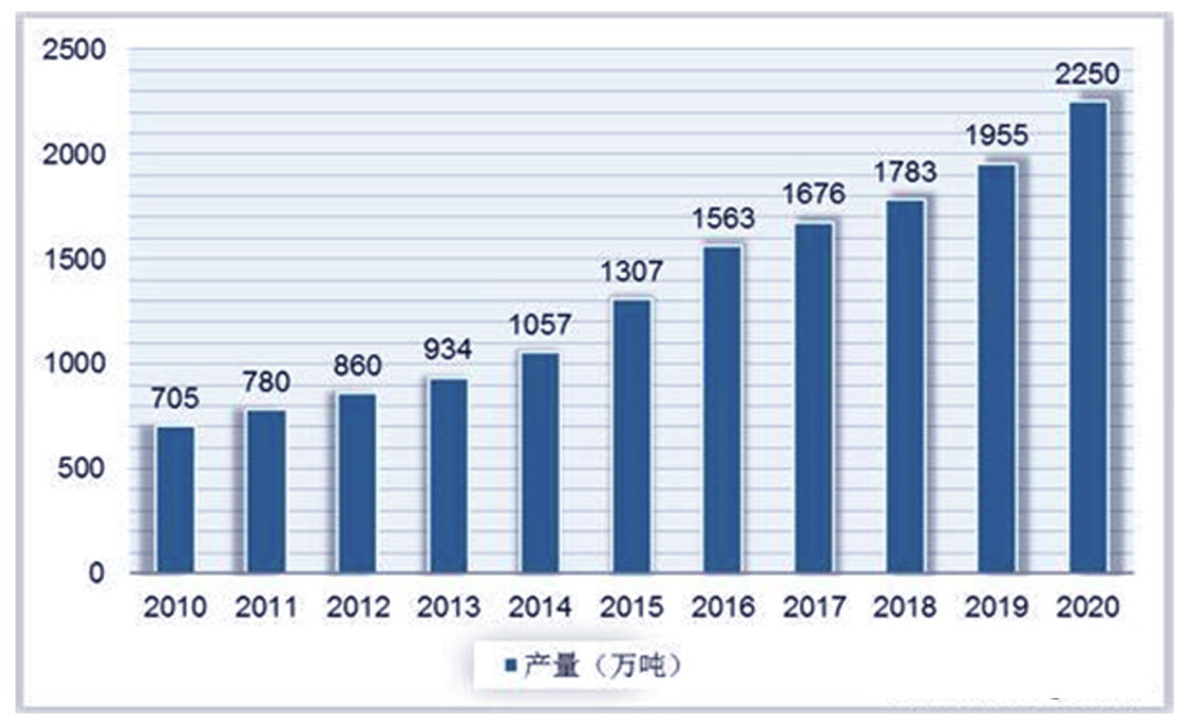 作为塑料产业的重要子行业和 高新技术产业,改性塑料近十年来持续受国家政策鼓励发展,被纳入优先发展的高新技术产业,,同时随着“以塑代钢,以塑代木”的推行,2010-2020年我国改性塑料产量逐年递增,从705万吨增至2250万吨。