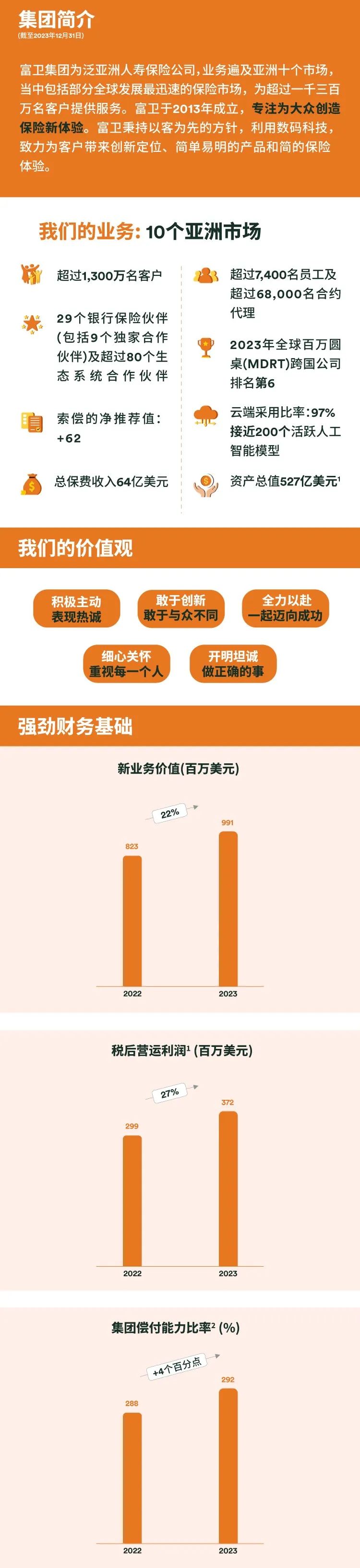 富卫集团有限公司于2023年 获得首个信用评级 主要保险经营实体的保险公司 财务实力评级为A级(惠誉) 和A3级(穆迪)