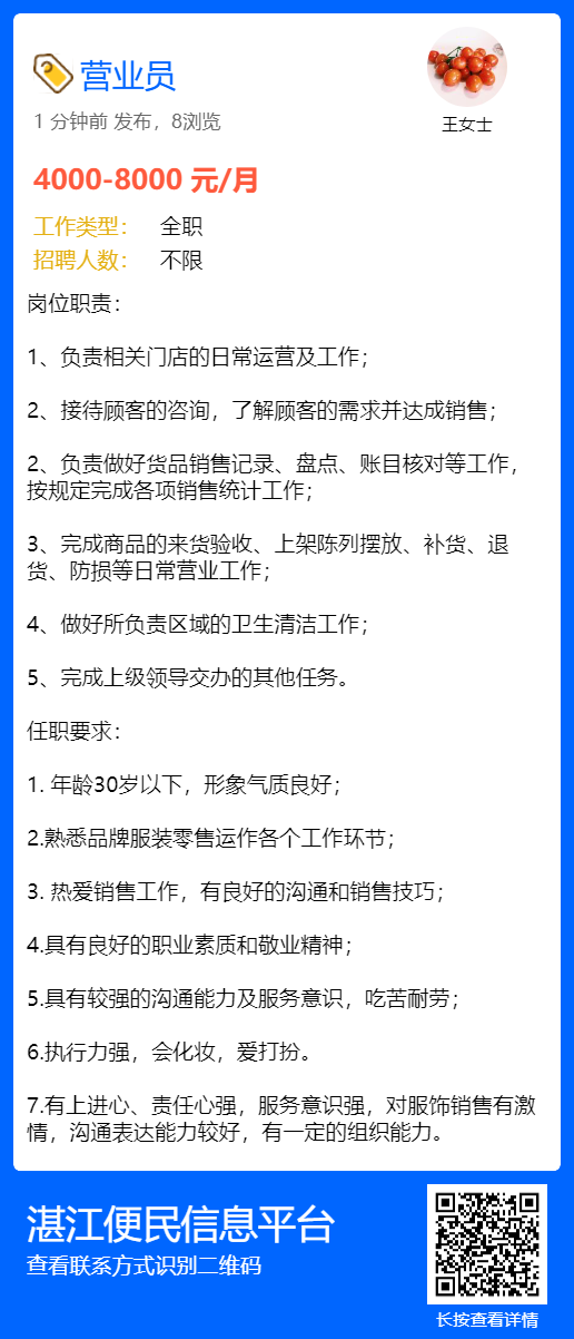 求职提醒:任何招聘若有收费的现象均有诈骗嫌疑,通常有体检费、贷款买车、培训费、押金、档案保管费、服装费、手续费、保密费、预留职位费、保证金等各种费用,都属非法行为。