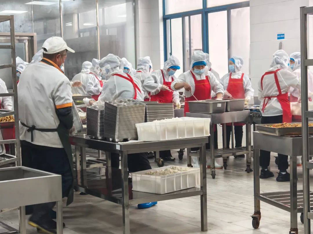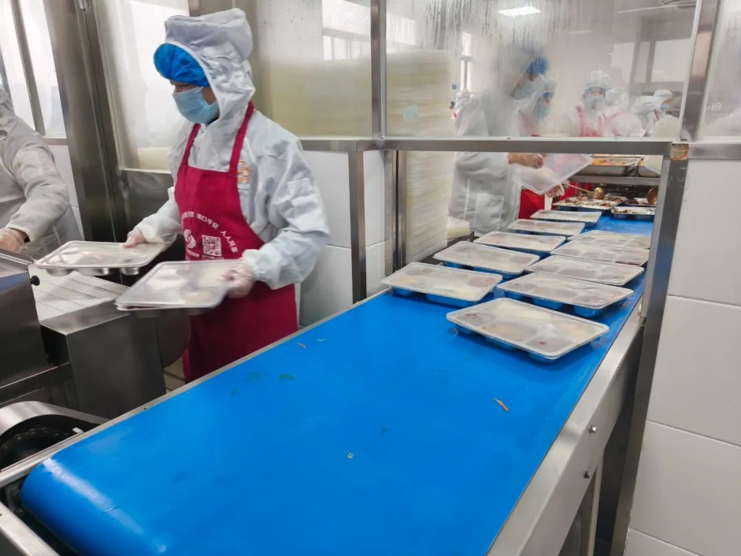 分餐车间中,工作人员流水线操作,快速熟练地完成学生餐的分配并将其密封。分装完成的学生餐,通过微波隧道进行杀菌提温。由专门的车辆运送至学校