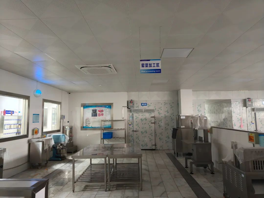 通过预浸泡、削皮及切割、高频震筛,先后多道水流式清洗,去除瓜果蔬菜表面残留的污染物。肉菜、生熟食品分离处理,减少交叉污染的机会。
