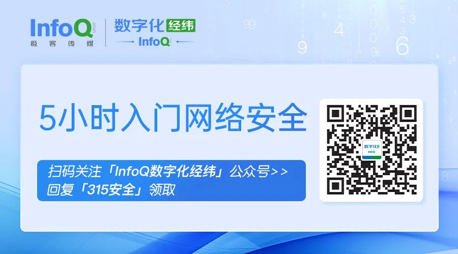 共筑诚信,共享安全。“3·15”之际,我们特别推荐《5 小时入门网络安全》免费课程,带您了解网络安全行业发展趋势,一同关注数据世界安全。同时,我们整理了腾讯、快手、蚂蚁集团等大厂的安全相关实践 PPT/ 报告。关注「InfoQ 数字化经纬」,回复「315 安全」领取免费课程及资料。