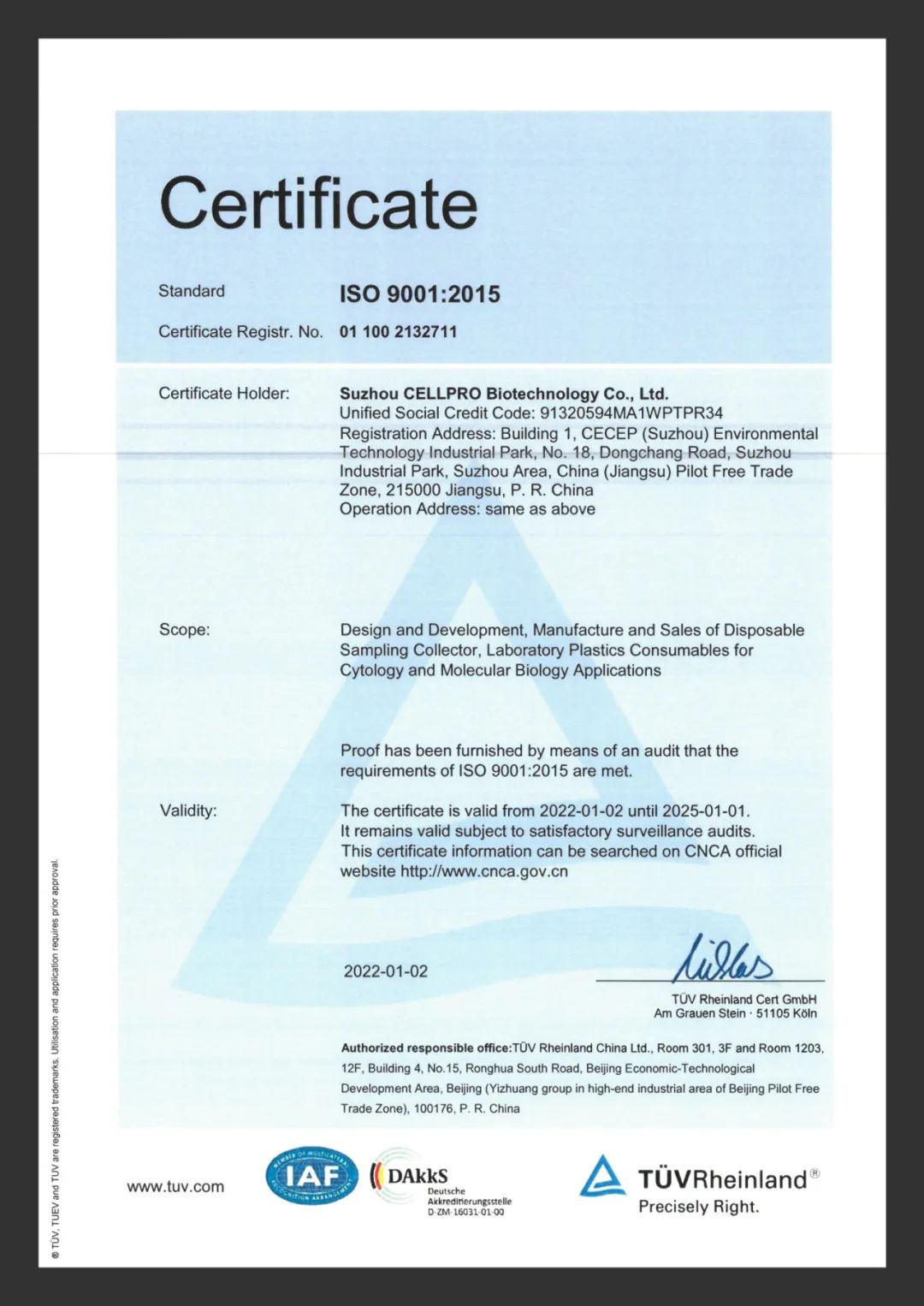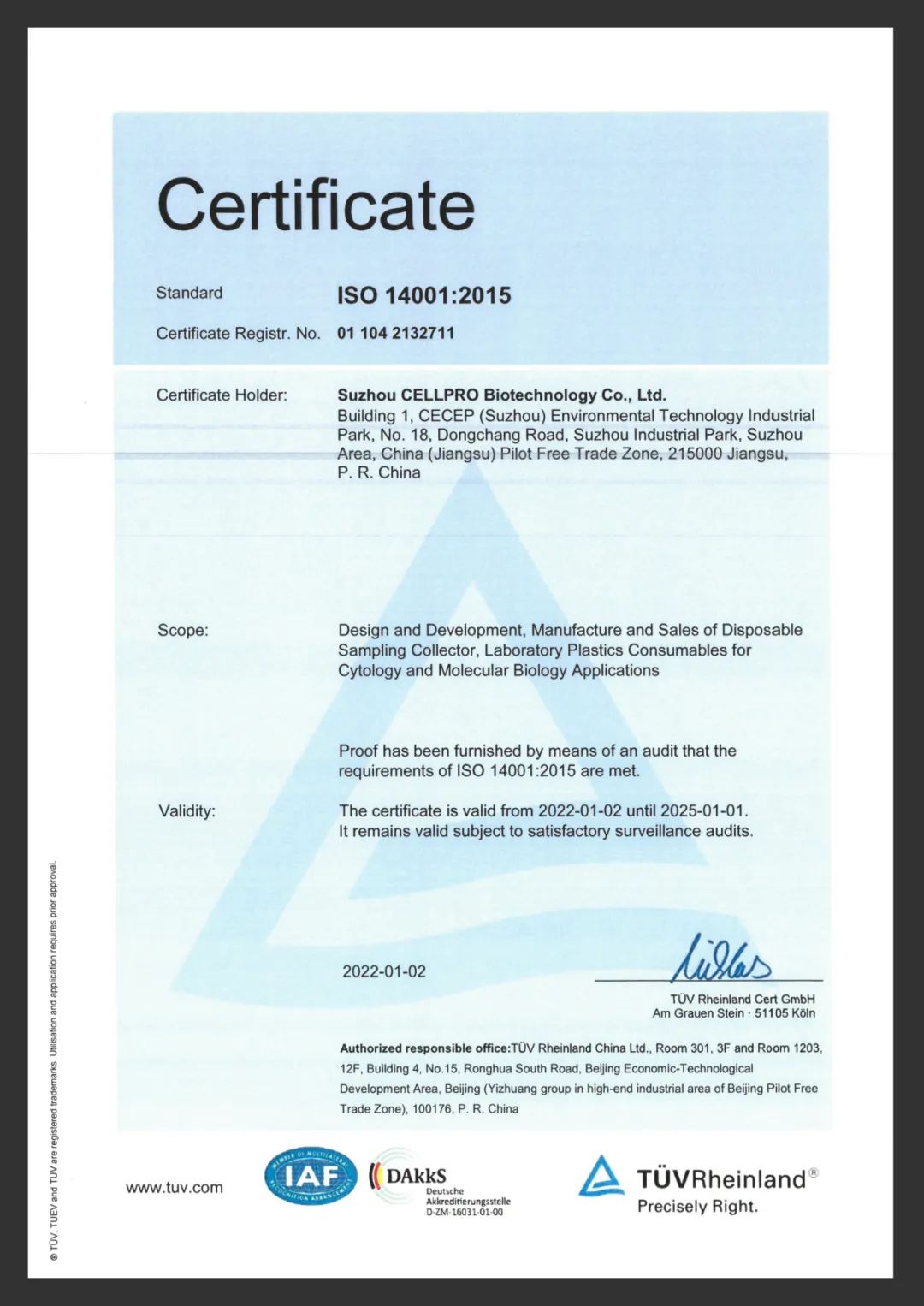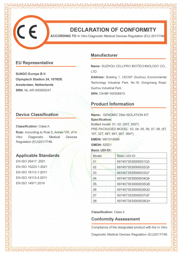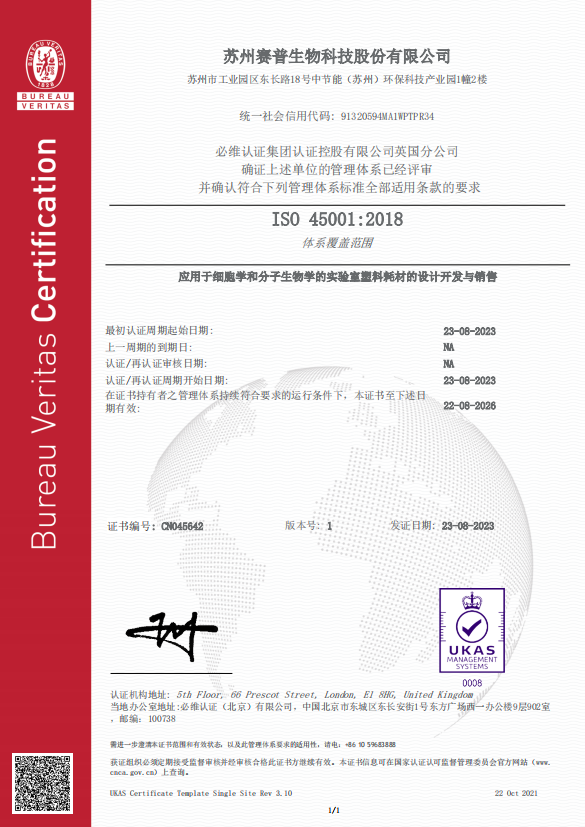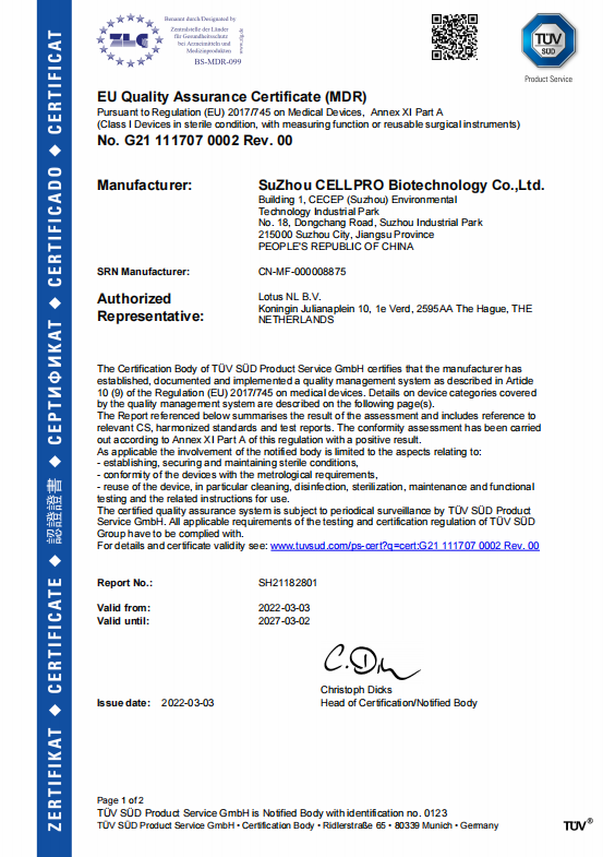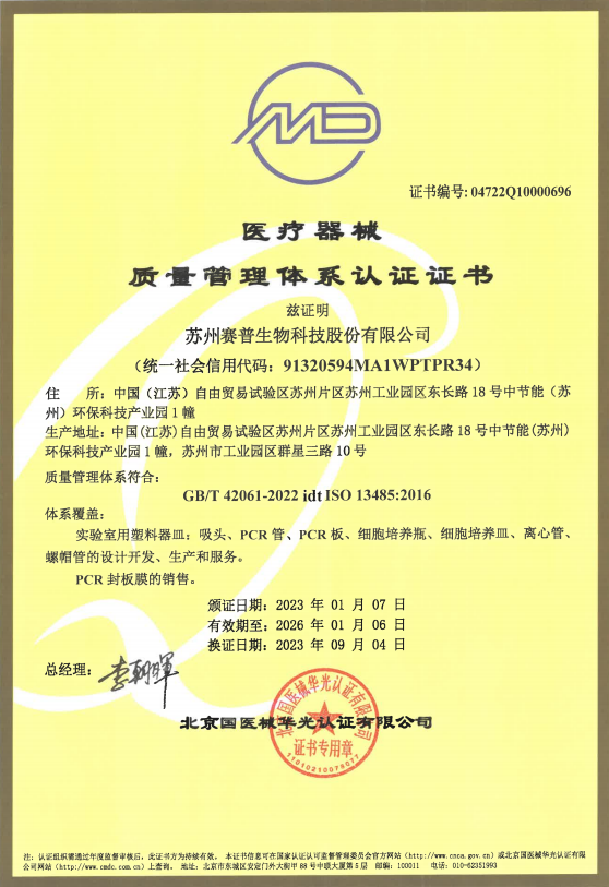 CellPro 赛普拥有3大生产基地(总建筑面积约 48,000 ㎡),配备 10000 ㎡十万级洁净车间,8000 ㎡万级洁净车间,实验室产品已通过SGS ISO13485/ISO9001/ISO14001 质量管理体系认证;生物制药类产品分布在GMP A\B\C级环境生产,已全部通过SGS ISO9001/ISO13485 /ISO15378验证;医疗器械部分产品已通过CE- MDR 认证和 FDA 产品注册备案。