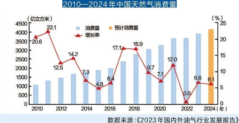 2023年,受宏观经济回升向好、气价下行和替代能源供应等因素综合影响,中国天然气消费量为3917亿立方米,同比增长6.6%。全年国产气2353亿立方米(含煤制气),增速5.7%,连续7年增产超100亿立方米。受国际油气价格下跌影响,进口天然气恢复增长,进口总量1656亿立方米,增速9.5%。对外依存度为42.3%,较上年上涨1.1个百分点。其中,进口管道气受中俄东线增量拉动,达到671亿立方米,同比增长6.4%;进口LNG7132万吨(约984亿立方米),同比增长11.7%。基础设施建设取得积极进展。西气东输三线湖北段、蒙西管道一期等管道投产,中俄东线、西气东输一线等主干管道实现互联互通。截至2023年底,天然气长输管道总里程达8.7万公里。中国在役储气库(群)29座,储气调峰能力达230亿立方米,占国内天然气消费量的5.9%。新天唐山、天津南港等6座LNG接收站投产(含扩建),合计新增LNG接收能力1880万吨/年。截至2023年底,全国总接收能力达1.16亿吨/年,首破1亿吨。