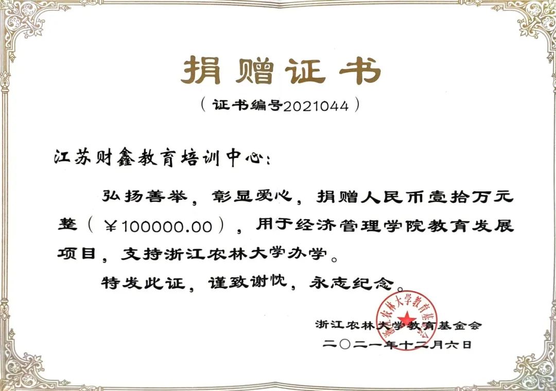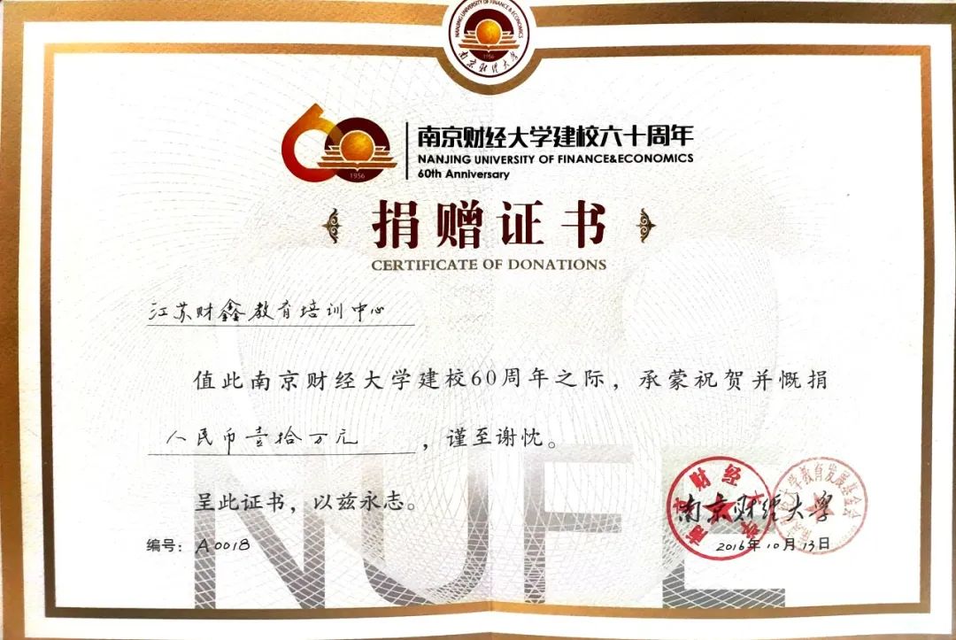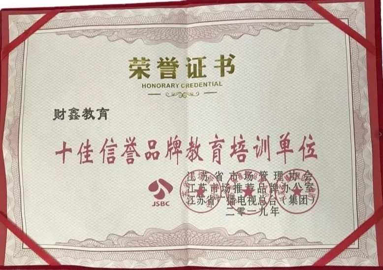 2014年被江苏省广播电视总台授予“江苏优质诚信办学机构”;2015年被江苏省民政厅评估为“中国社会组织评估等级4A级机构”;2016年被南京市教育局评为“先进民办学校”;2017年财鑫被媒体授予“品牌实力教育机构”;2018年美国管理会计师协会(IMA)授予财鑫教育“CMA高校管理会计人才培养突出贡献奖”,南京市社会培训行业协会授予财鑫教育“先进单位”;2019年财鑫被授予“十佳信誉品牌教育培训单位”,并被南京市教育行业协会评为“先进民办学校”;2020年美国管理会计师协会(IMA)授予财鑫教育“CMA高校管理会计人才培养突出贡献奖”;媒体授予“江苏省教育行业典范培优基地”;南京市社会培训行业协会授予财鑫教育“先进单位”;2020年被南京市教育局评为“南京市先进民办学校”;2021年度聘请财鑫教育成为江苏省社会组织评估委员会委员单位;2023年荣获“2023年CMA管理会计人才培养卓越贡献奖”……