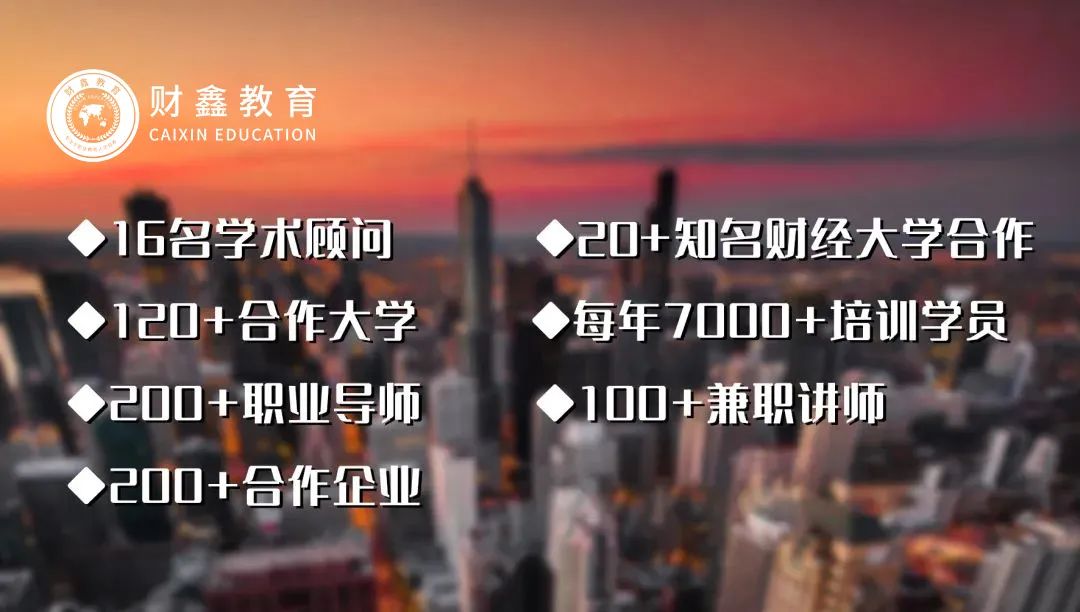财鑫教育是国内知名的高端财经金融培训机构,是国内最早从事财会培训的机构之一。财鑫教育一直致力于推进将国外先进的课程体系引入国内,专注于与国内一百多所知名高校的合作及大中型企业和事务所的合作,提供高质量的财鑫教育课程教学体系,财鑫教育以雄厚的专业师资、优质的服务、丰富的教学经验、敬业的态度和专业经验获得广泛好评,成为了行业标杆。