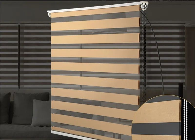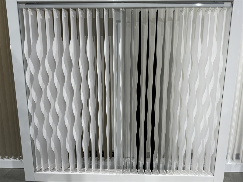 以一款水波纹百叶窗为例,素净的白色页片间点缀着灰和黑,竖形页片摈弃了传统的垂直线条,取代以波光粼粼的湖面水波纹式样,闭合时可做到完全遮光。