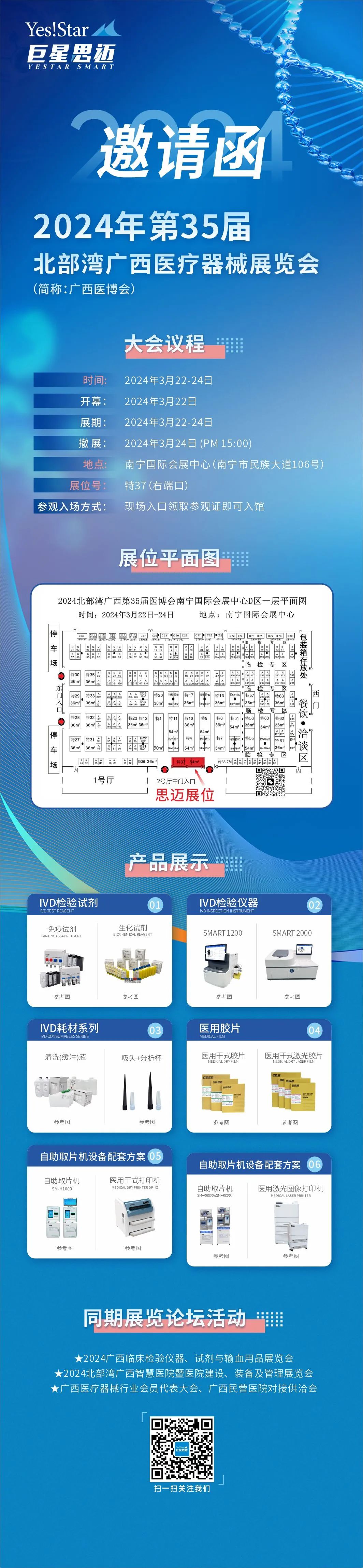 2024年第三十五届北部湾广西医疗器械展览会于2024年3月22日-24日在南宁国际会展中心举行,巨星思迈将携IVD检验试剂/仪器/耗材、医用胶片/取片机设备等多种产品参展,现诚邀各位合作伙伴莅临展位【D区一层 特37】进行现场指导及业务交流,巨星思迈期待您的到来!