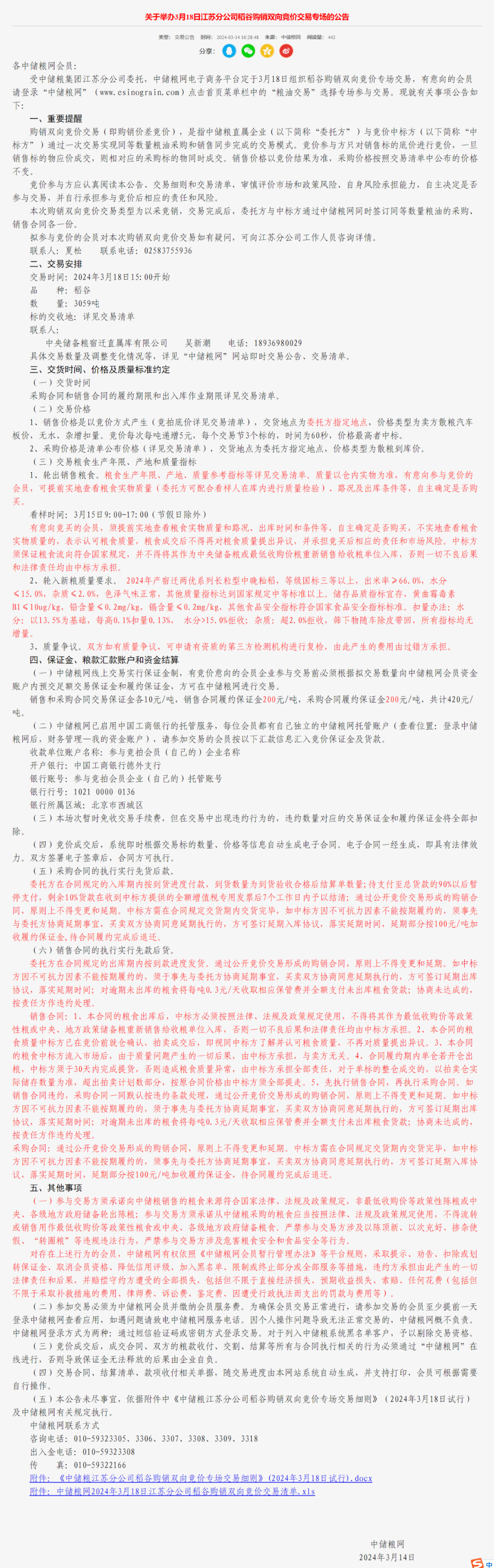 关于举办3月18日江苏分公司稻谷购销双向竞价交易专场的公告