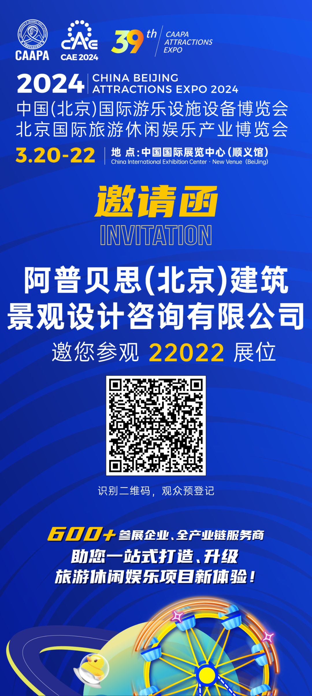 中国游艺机游乐园协会(CAAPA)主办的2024中国(北京)国际游乐设施设备博览会暨2024北京国际旅游休闲娱乐产业博览会将于3月20-22日于北京·中国国际展览中心(顺义馆)举办。阿普贝思景观设计与云研游乐携手参加此次展会,展位位于 W2 馆-22022 号。