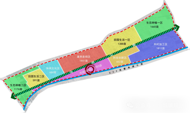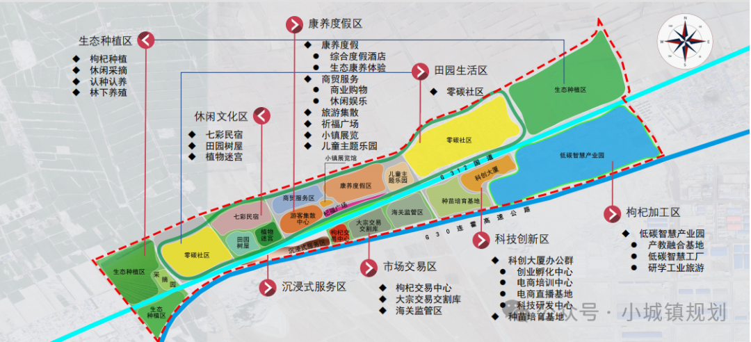 休闲文化区。重点建设植物迷宫、七彩民宿和田园树屋。根据空间需求布局文化长廊、房车营地、花海等休闲旅游元素,通过“枸杞”产业公园化发展理念,为小镇建设赋魂,产业发展赋能。