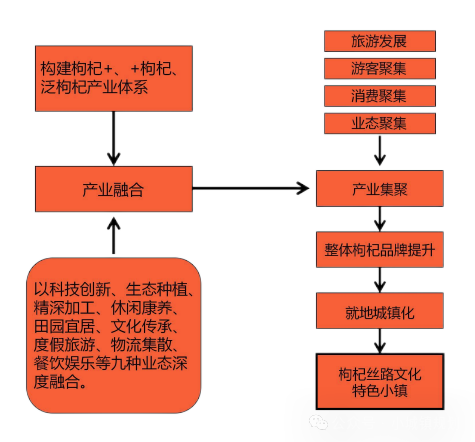 以精河县枸杞丝路文化特色小镇建设为载体,以枸杞产业为主导,产业融合发展为重点,构建“枸杞+”“+枸杞”的泛枸杞产业体系,推进产业业态深度融合;立足区域资源禀赋和产业发展基础,以旅游、消费等推动特色产业集聚,系统推动枸杞品牌提升;以文化润疆为引领,融入民族风情和丝绸之路文化内涵,打造“红色”鲜明、“绿色”宜居、康养结合、人文浓厚的特色枸杞产业,为以人为核心的小城镇产业转型和重构提供可持续解决方案。