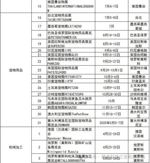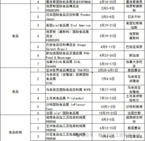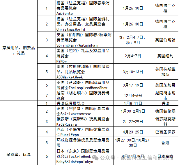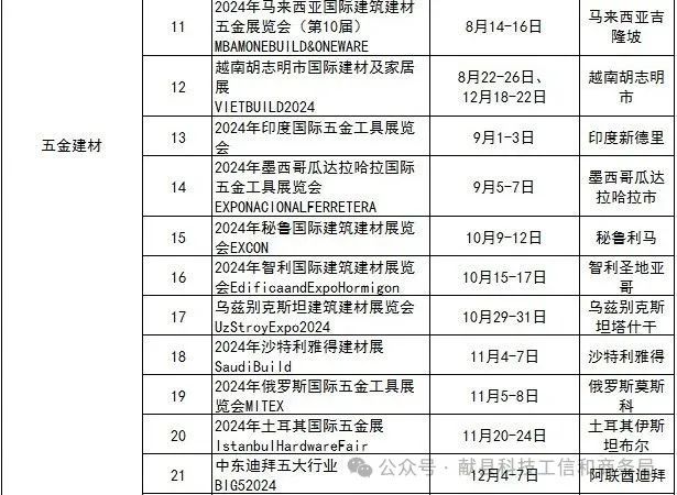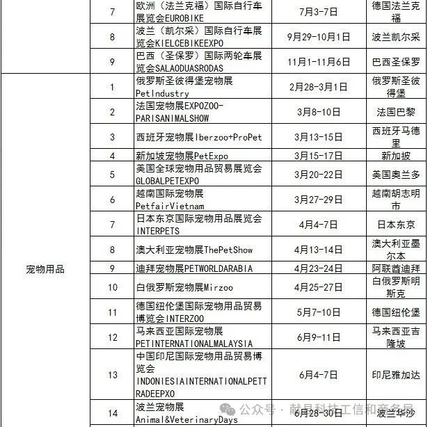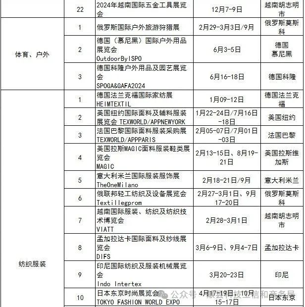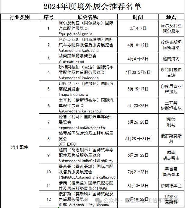 为支持我县外贸企业积极参加国际展会,广泛接触客商,争取国际订单,深度开发市场,推动我县外贸稳规模优结构,科技工信和商务局认真筛选出2024年度与我县各产业集群关联度较高的境外展会推荐名单,现予以公布(详见附表)。凡参加境外展会企业均可通过我局申请商务部外经贸发展专项资金-中小企业开拓市场资金项目支持(具体支持条件、标准以河北省商务厅文件要求为准)。