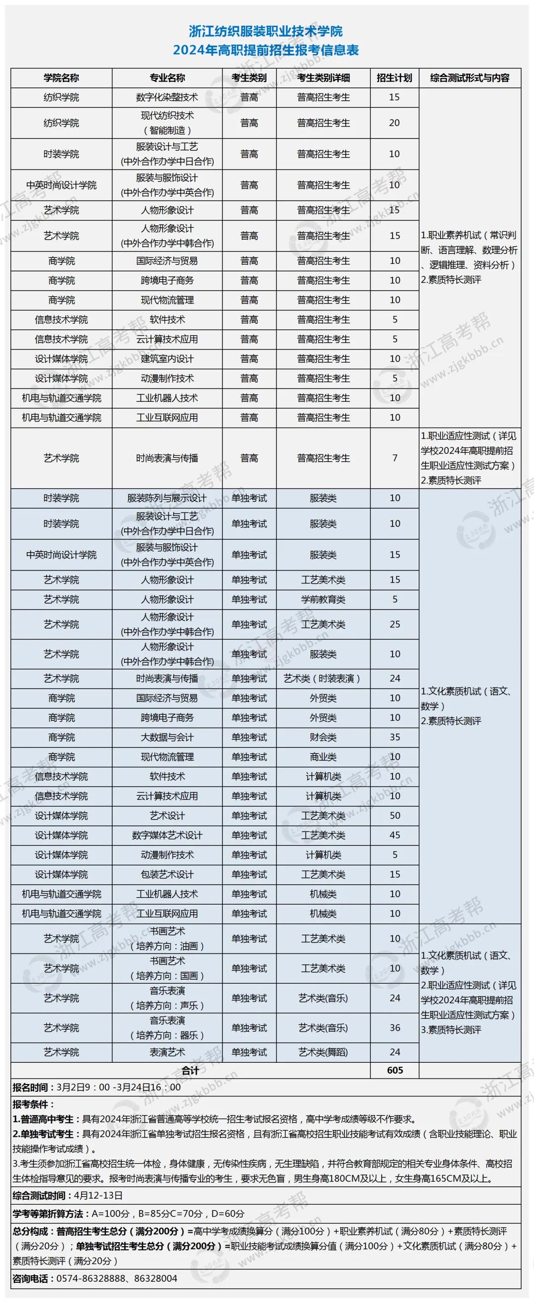 综合测评分四个模块:职业素养机试(常识判断、语言理解、数理分析、逻辑推理、资料分析);文化素质机试(语文、数学);职业适应性测试(详见学校2024年高职提前招生职业适应性测试方案);素质特长测评: