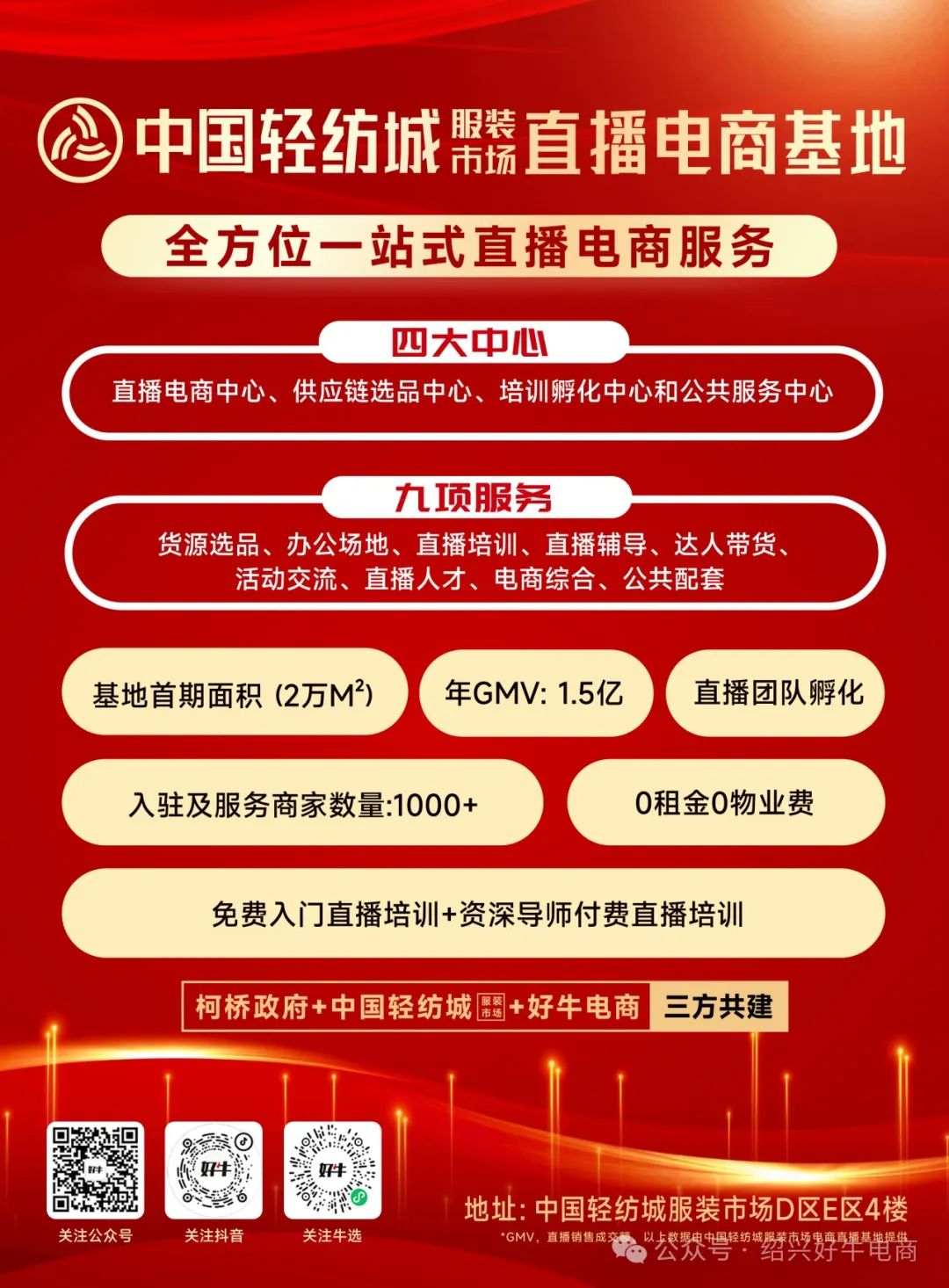 中国轻纺城服装市场直播电商基地位于市场家纺区域四楼,占地约20000平方米,由绍兴市柯桥区人民政府支持设立,中国轻纺城服装市场提供场地,浙江好牛集团有限公司招商运营,自2023年4月20日正式开园,全部用于直播业务的开展,2023年度累计GMV达到1.52亿元。