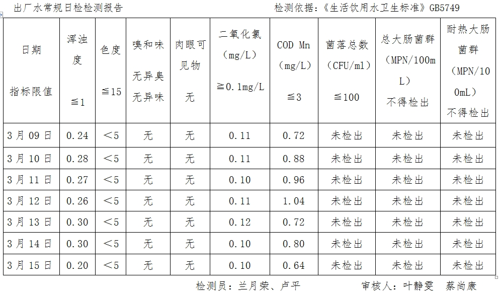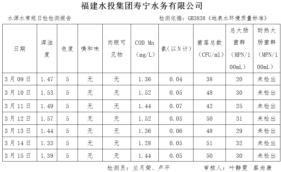 寿宁水务公司3月9日-3月15日水质公示报告