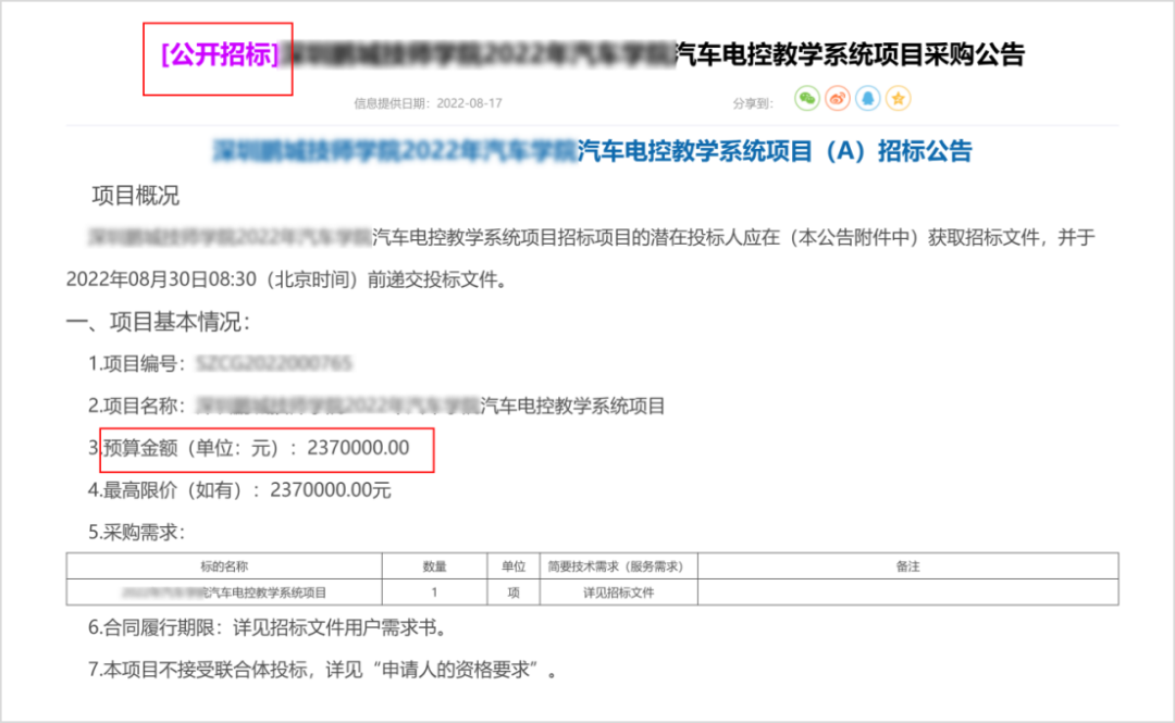 该项目是汽车电控教学系统项目,采用公开招标的采购方式,预算金额为237万元。