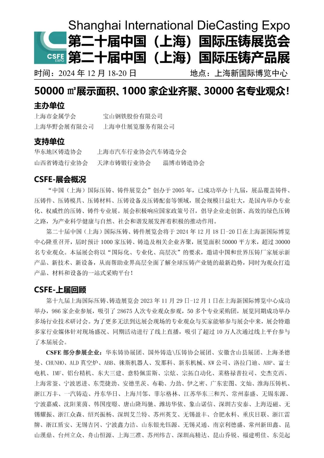 需要参展的企业可以先点击连接2024第二十届中国(上海)国际压铸展览会展位申请表,等展位确定好后直接将参展申请表打印出来填写好盖章回传到主办单位,主办单位收到申请表后也会尽快上报公司帮您把展位确定下来,谢谢!