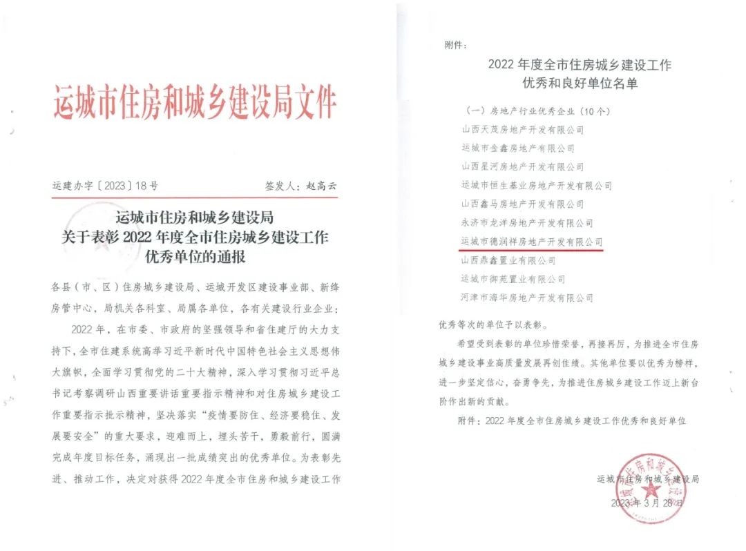 3月15日,运城市住房和城乡建设局公布2023年度全市住房城乡建设系统优秀和良好单位名单。正通·万和城项目开发公司——运城市德润祥房地产开发有限公司,凭借卓越实力,再次荣获房地产行业优秀企业十强。