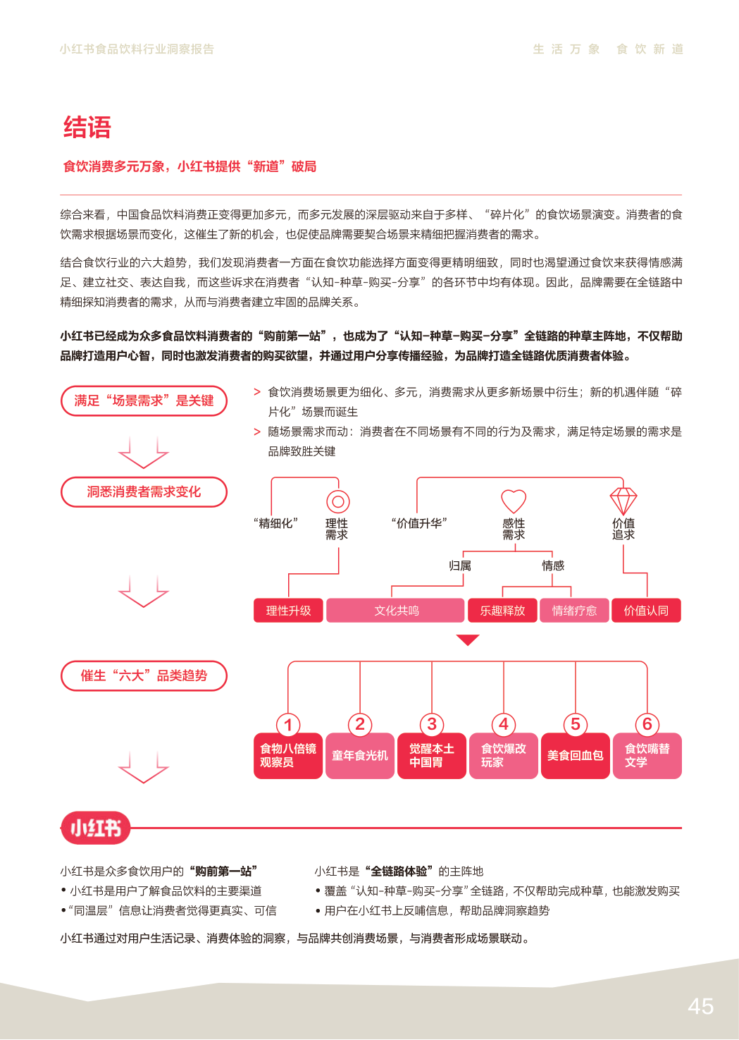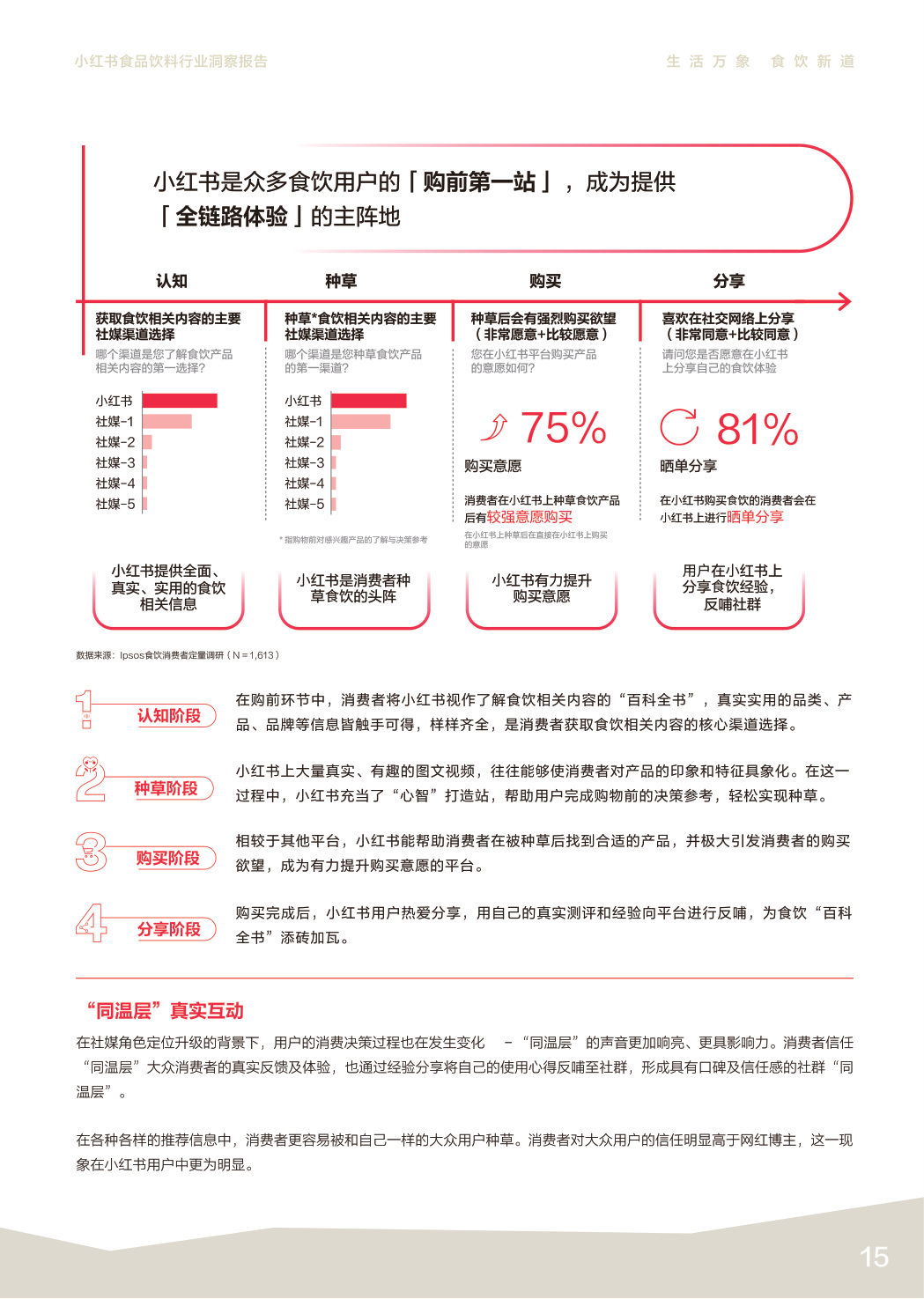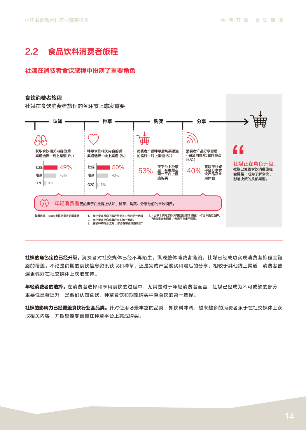 导读:在消费需求和行为日益多元化的今天,消费者行为链路也更加复杂和多元。在食品饮料行业,消费者的决策链路不再单一。消费者既会一时兴起“冲动”下单,也会由于关注成分、健康而“精挑细选”。伴随食品饮料行业消费者愈发“专业化”,种草成为食饮行业消费的重要一环。我们此次食品饮料行业研究也发现,小红书已经成为食品饮料用户“认知-种草-购买-分享”全链路的种草主阵地。