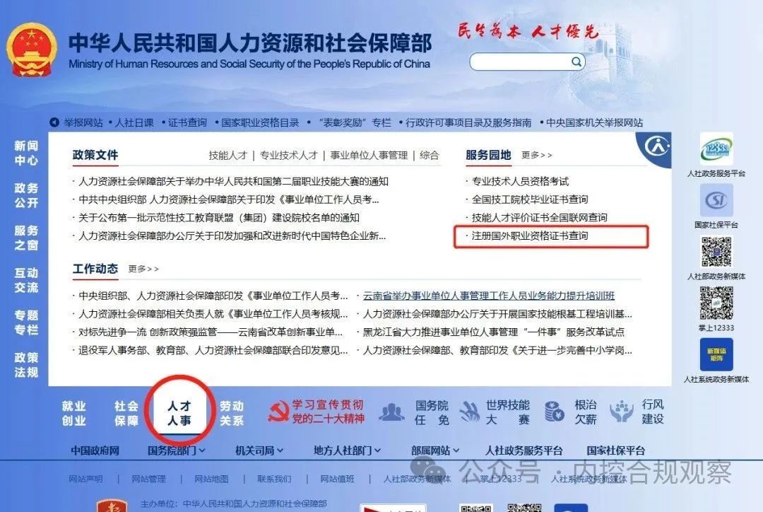 第一步:登录人力资源和社会保障部网站:http://www.mohrss.gov.cn/,依次点击:人才人事-注册国际职业资格证书查询