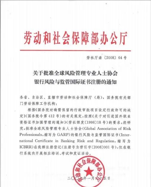 2008年1月25日国家劳动和社会保障部办公厅《关于批准全球风险管理专业人士协会银行风险 与监管国际证书注册的通知》(劳社厅函[2008]64号),经研究,批准全球风险管理专业人士协会(GARP)的银行风险与监管(ICBRR) 国际证书项目注册登记(注册号为劳引字[2008]001号),在国内开展培训、考试和发证活动。