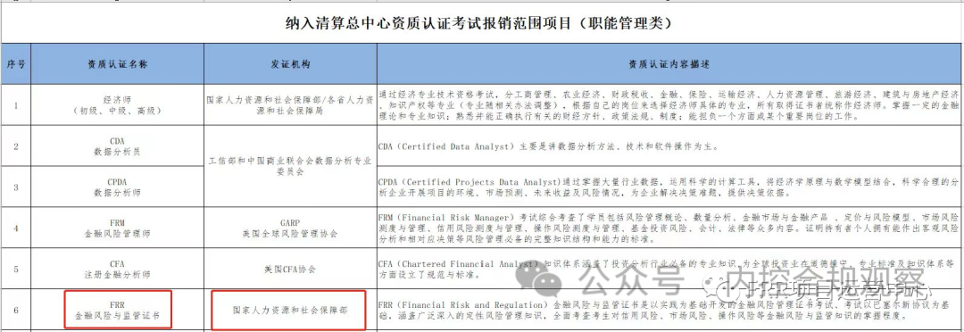 FRR证书被中国人民银行清算总中心列为资质认证考试报销项目范围