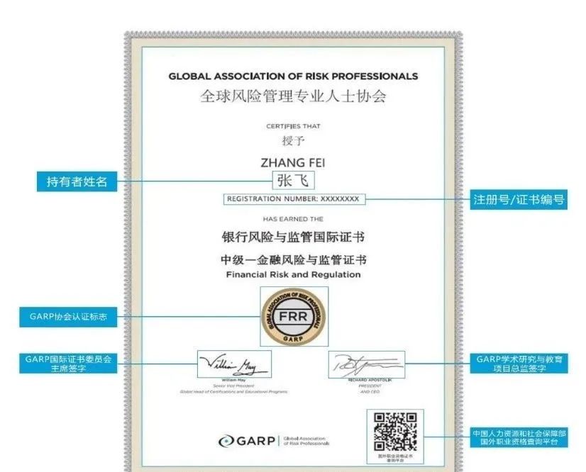 学员通过 GARP 官方组织的 FRR 全国统一考试合格后,由全球风险管理专业人士协会(GARP)颁发 FRR 资格证书,并加贴国家人力资源和社会保障部注册认证标识,纳入国家职业资格证书统一管理体系。