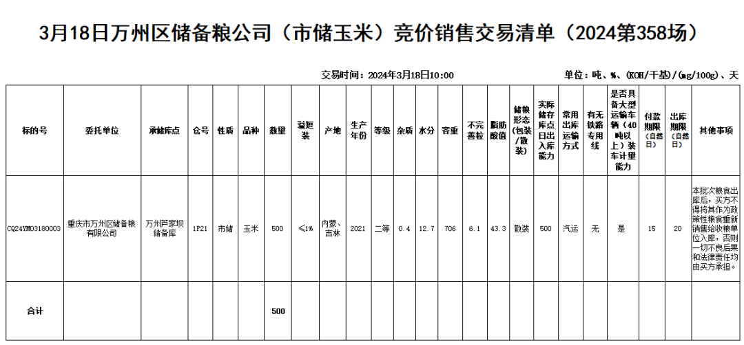 受重庆市万州区储备粮有限公司委托,重庆市粮油批发市场有限责任公司(即国家粮食重庆交易中心,以下简称“批发市场公司”)定于2024年3月18日10:00举办万州区储备粮公司(市储玉米)竞价销售交易会,现将有关事项公告如下: