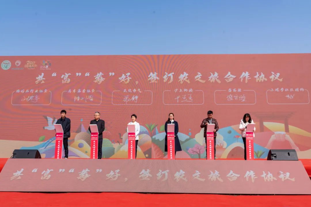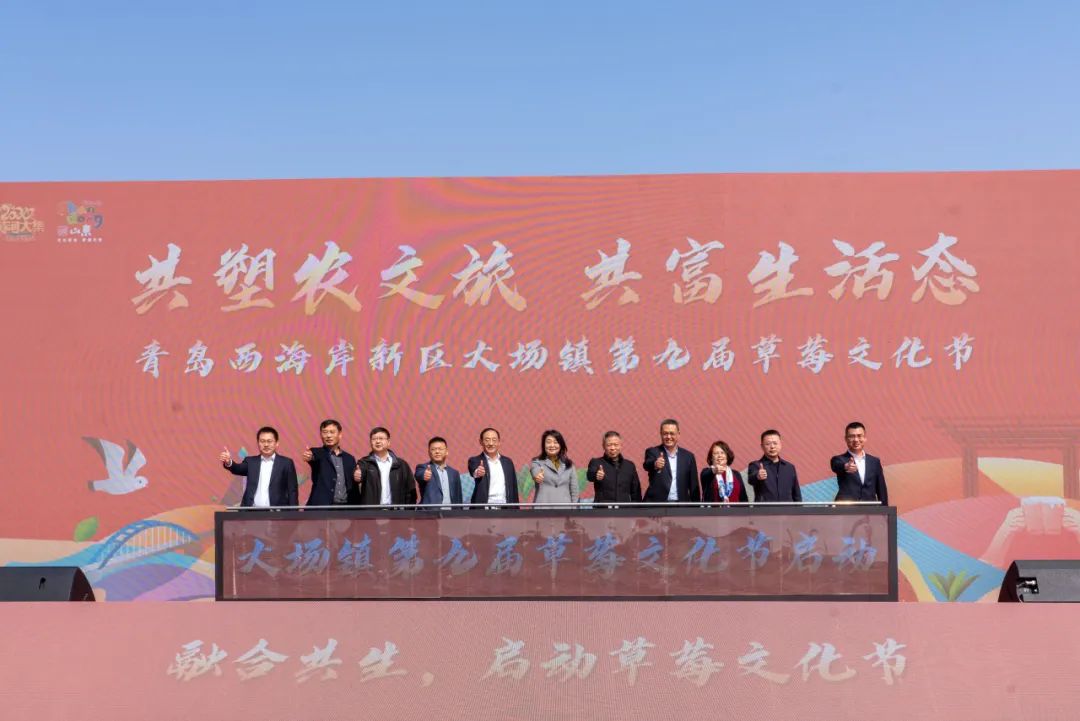 大场镇党委书记孙涛为启动仪式致辞,他表示,大场镇作为全国农村综合性改革试点试验镇、山东省农业产业强镇,近年来,在新区工委管委的领导下,构建了“以农筑底、以文化人、以旅促兴”的“农文旅”乡村振兴发展路径。以此次活动为契机,大场镇将积极探索农文旅融合发展,嵌入体育赛事、旅游观光、研学拓展等元素,放大草莓节、吉湄樱花市集、丰收节等效应,不断绘就农旅融合的乡村振兴新画卷。