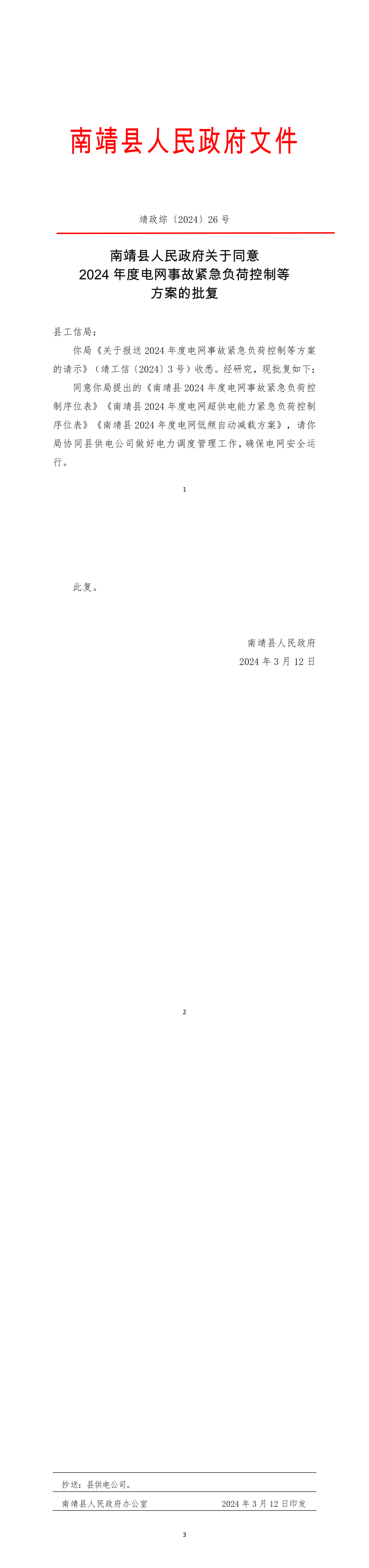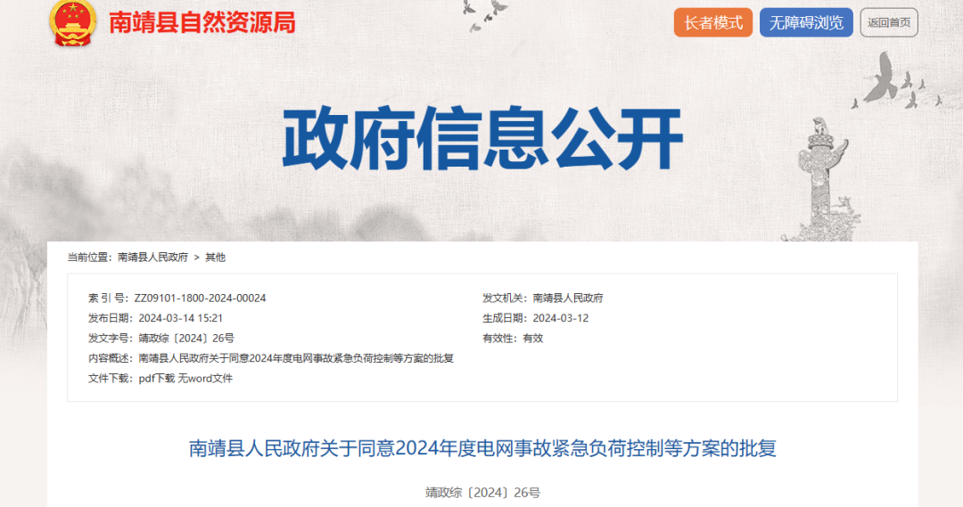 2024年3月14日,福建省漳州市南靖县同意2024年度电网事故紧急负荷控制等方案的批复(靖政综〔2024〕26号)。