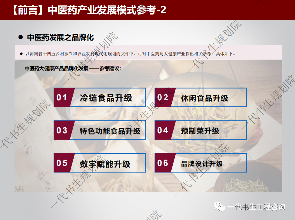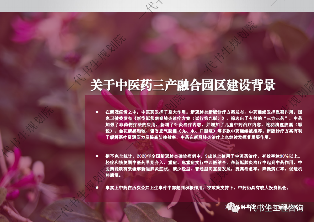 以下是中医药三产融合园区建设方案,仅为部分内容的截图,非全部。中医药产业园建设规划与咨询、康养项目建设与咨询,请联系:173-1243-6919(李老师,微信同号)。