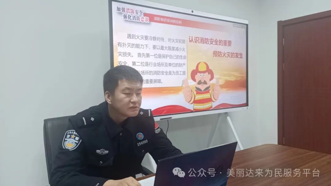 达来边境派出所民警张鹏就《消防安全责任实施办法》和消防安全职责等内容进行了专题培训,现场分析了辖区当前消防安全形势及火灾防控工作中存在的问题和不足,对各行业场所日常火灾防范、安全隐患自查、各类消防器材使用方法和注意事项、简单实用的逃生自救方法等方面作了细致讲解。