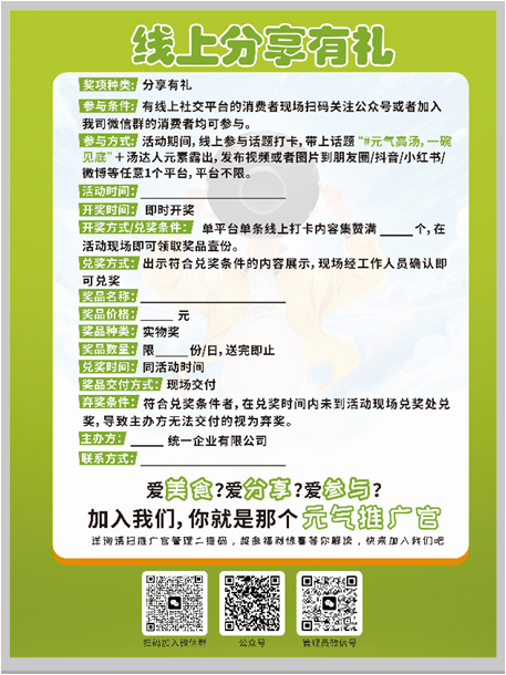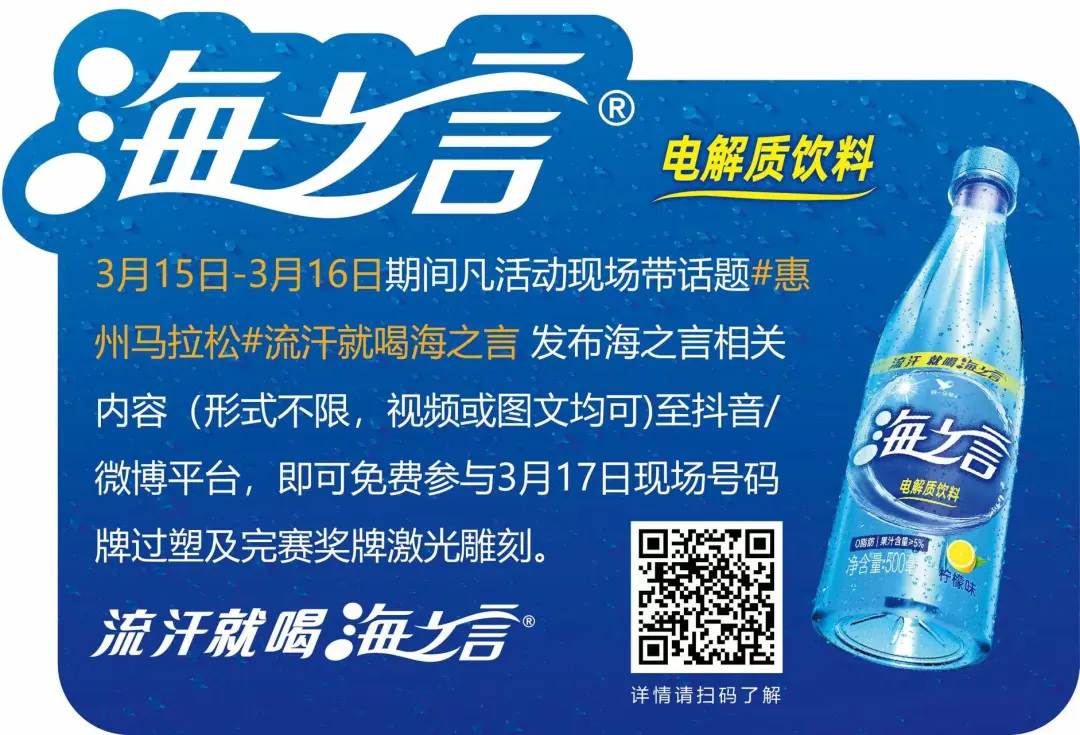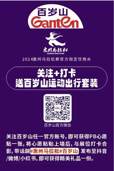 关注百岁山任一官方账号,即可获得PB心愿贴一张,将心愿贴贴上墙后,与展位打卡合影,带话题#惠州马拉松#百岁山发布至抖音/微博/小红书,即可获得精美礼品一份。