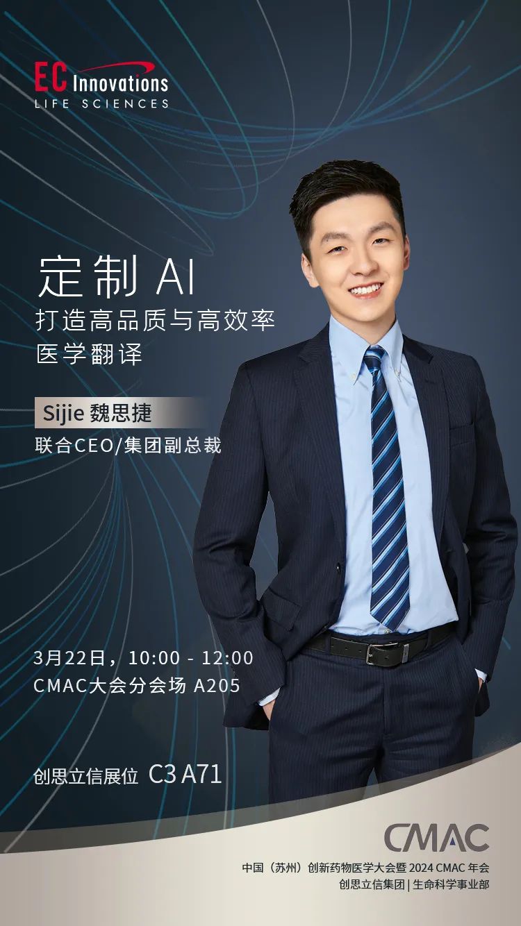 3 月 22 日上午,在大会热点话题 “全球注册翻译策略 ” 论坛上,创思立信集团副总裁魏思捷将以“定制 AI - 打造高品质与高效率医学翻译”为主题发表演讲,同与会嘉宾分享创思立信的技术方案与最佳实践。
