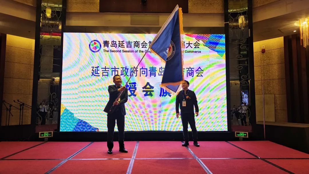 大会第六项,延吉市政府商务局局长辛星海向青岛延吉商会郑圣一会长授会旗。希望,郑圣一会长高举青岛延吉商会的会旗,再创新辉煌。