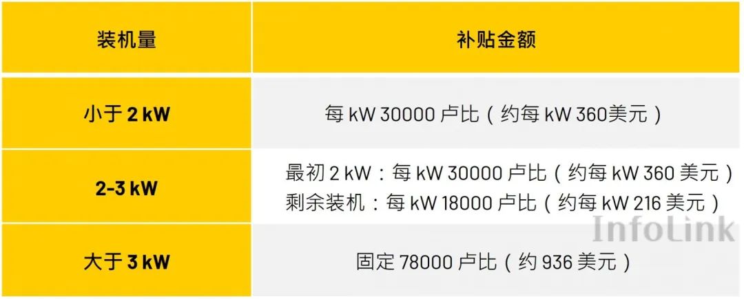 此计划前身为 2019 年启动的屋顶光伏计划第二阶段(Grid Connected Rooftop Solar Programme, RTS),目标在 2026 年前分布式累积装机达到 40 GW,但截至 2023 年底,印度分布式累积装机仅有 11 GW 左右,政府急需加大政策力度以刺激需求。2024 年 2 月,政府将 RTS 更名为 PM Surya Ghar 总理光伏家庭计划,并表示未来将耗资 7,500 亿卢比,透过补助安装屋顶光伏,为一千万户家庭提供每月最多 300 kWh 的免费用电,最新的补助办法如下:总理光伏家庭计划延续了过去 RTS 中针对每户家庭的资金补助,并增加了金额,然而,由于 MNRE 尚未公布完整法案,未来是否会继续沿用 RTS 的既有政策,例如过去给予 DISCOM 光伏安装成本 20-40% 不等的资金补助,以及超额完成装机目标的奖励金,亦或是推出全新的激励措施,还得持续观望。