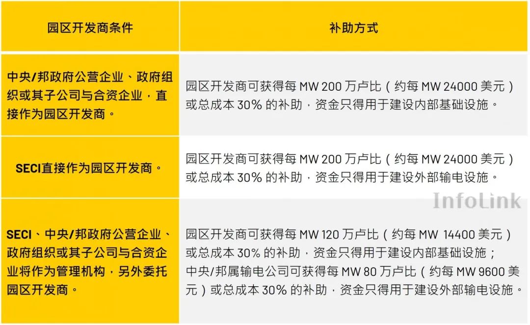 2014 年上路的大型集中式项目政策,目标在 2025-2026 年之前新增 40 GW 的光伏装机,整体计划由印度国营光伏公司 SECI(Solar Energy Corporation of India)负责管理,各邦政府有权划分项目用地,同时选择一个机构作为园区开发商,负责光伏园区的建设。每个项目能获得每 MW 200 万卢比(约每 MW 24,000 美元)或总成本 30% 的补助(以较低者为准),园区开发商的选择与相应补助方案如下:
