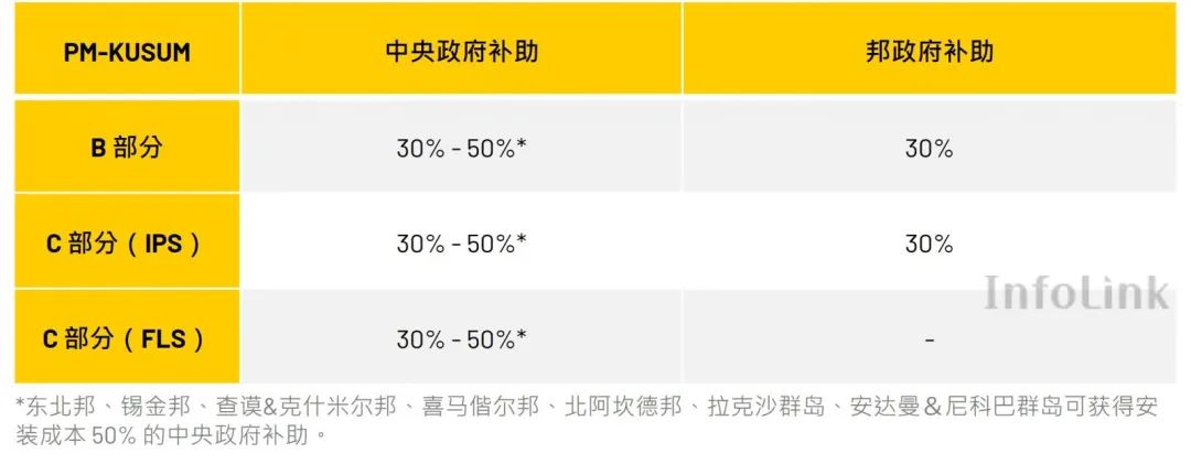 PM-KUSUM 农民能源安全与发展计划(Pradhan Mantri Kisan Urja Suraksha evam Utthaan Mahabhiyan Yojana)2019 年启动,总预算约为 3,442 亿卢比(约 41.3 亿美元),旨在透过光伏来确保农地用电,预计 2026 年以前新增装机达到 34.8 GW,政策分为 A、B、C 三部分。