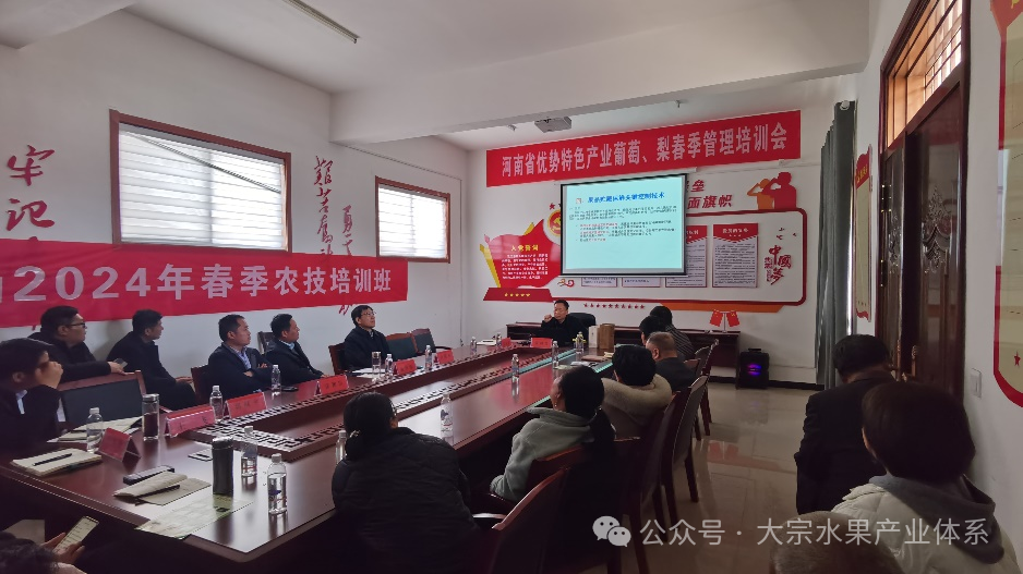 2024年3月14日,河南省农业科学院园艺研究所所长尚泓泉、河南省大宗水果产业技术体系岗位专家张四普和国家梨产业技术体系郑州综合试验站团队成员郭献平等一行4人,在民权县国营农场会议室开展了春季葡萄、梨管理,以及梨保鲜技术与加工实例等技术培训。民权县国营农场祝学强场长及全体领导班子、果树种植户40余人参加了培训。