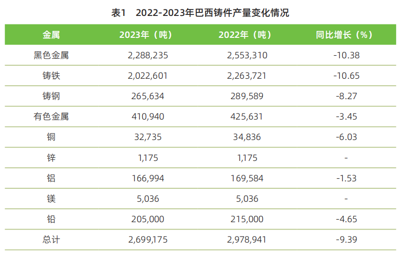 2023年巴西铸件产量中,2,354,378吨用于国内市场需求,占到总产量的87.22%,与2022年相比,同比下降10.5%。