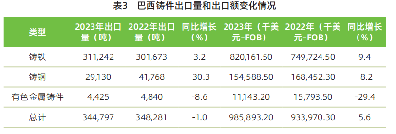 2023年巴西铸件出口量为344,797吨,同比下降1.0%。按金属类型划分,出口量及出口额变化情况如表3所示。2023年,铸件出口量占巴西铸件总产量的12.8%,2022年,这一比重为11.6%。在国内市场出现严重下滑的情况下,出口量占比的提升,对于巴西铸造业而言,尤为重要。