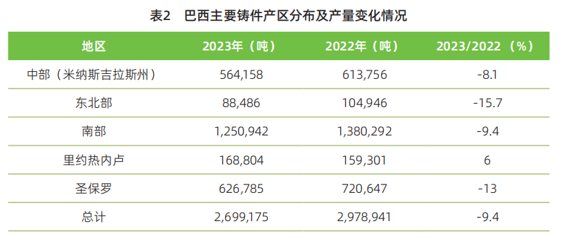 2023年,巴西铸件产量约为269万吨,同比下降9.4%。其中铸铁件约202万吨、铸钢件约26.56吨和有色金属铸件为41.09万吨。按照有色金属铸件材质进行划分,铜(32,735 吨)、锌(1,175 吨)、铝(166,994 吨)、镁(5,036 吨)和铅(约20.5 万吨)。2023年巴西铸件产量情况及年际对比如表1所示。2023年巴西主要铸件生产区域分布及产量变化情况如表2所示。