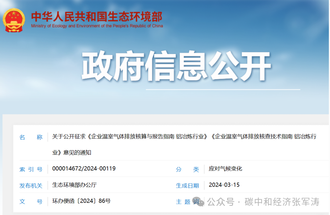 为加强企业温室气体排放管理,规范铝冶炼行业企业温室气体排放核算报告与核查工作,做好扩大全国碳排放权交易市场行业覆盖范围的制度体系建设,根据《碳排放权交易管理暂行条例》,生态环境部组织编制了《企业温室气体排放核算与报告指南 铝冶炼行业》《企业温室气体排放核查技术指南 铝冶炼行业》,现公开征求意见(征求意见稿及其编制说明等材料可登录我部网站http://www.mee.gov.cn/ “意见征集”栏目检索查阅)。