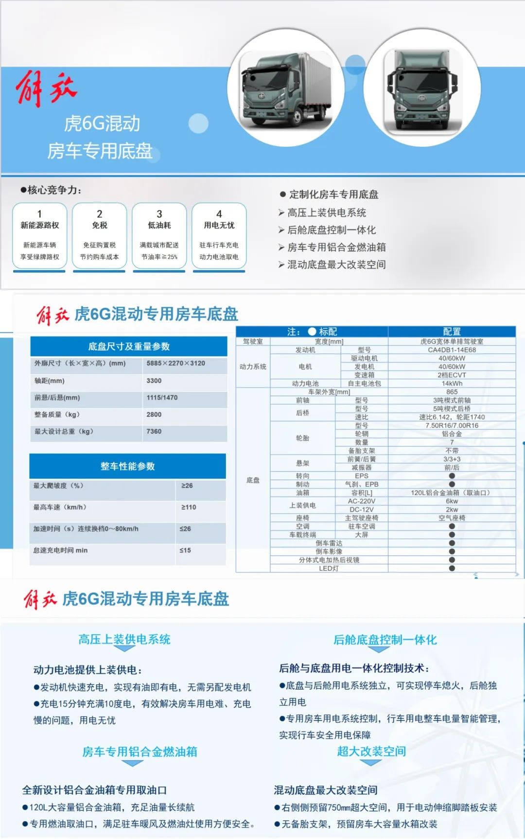 解放虎6G,八公分箱体隔热保温,新能源车辆享受绿牌免税,发动机快速充电,实现有油即有电,无需另配发电机充电,15分钟充满10度电,有效解决房车用电难、充电慢的问题,用电无忧。120L大容量铝合金油箱,充足油量长续航。专用燃油取油口,满足驻车暖风及燃油灶使用,方便安全。底盘与后舱用电系统独立,可实现停车熄火,后舱独立用电。